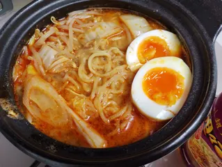 担々ごま うどん お昼に、担々ごま鍋の素を使って鍋焼きうどんを作りました あるもので直ぐに火が通る具材にしました味付けたまご、キャベツ、もやし、黒舞茸