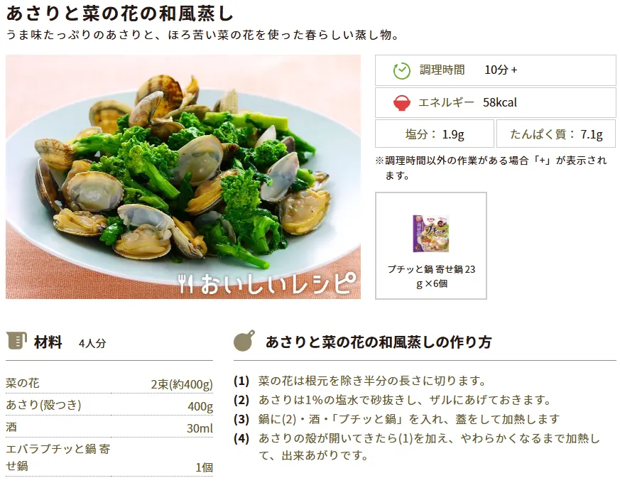 今週のおすすめレシピ②:あさりと菜の花の和風蒸し