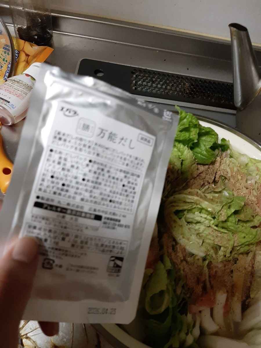 トップ > レストラン > 万能だし使いました。 すもすも50 2025/10/26 14:47 万能だし使いました。 寒くなったのと、白菜2個丸々購入したので 子供が好きな白菜のミルフィーユ鍋を作りました。 味付けは、エバラさんからもらった万能だしと 白だしのみ。 白菜と豚肉の出汁もあり すごくいいお出しになりました。 出汁が残ったものは、次の朝の味噌汁に 味噌あまり行けなくても十分美味しかった。 いいね 共有する 共有する X facebook LINE リンクをコピー コメントする 2 件の返信 (新着順) ミュートしたユーザーの投稿です。 投稿を表示 RR 2025/10/29 15:00 ミルフィーユ鍋にお出汁がぴったりですね おいしそうです いいね 返信する ミュートしたユーザーの投稿です。 投稿を表示 めぐ 2025/10/27 07:55 調味料が少ないとラクですね。野菜もたくさん取れて、言うことなしです。 いいね 返信する