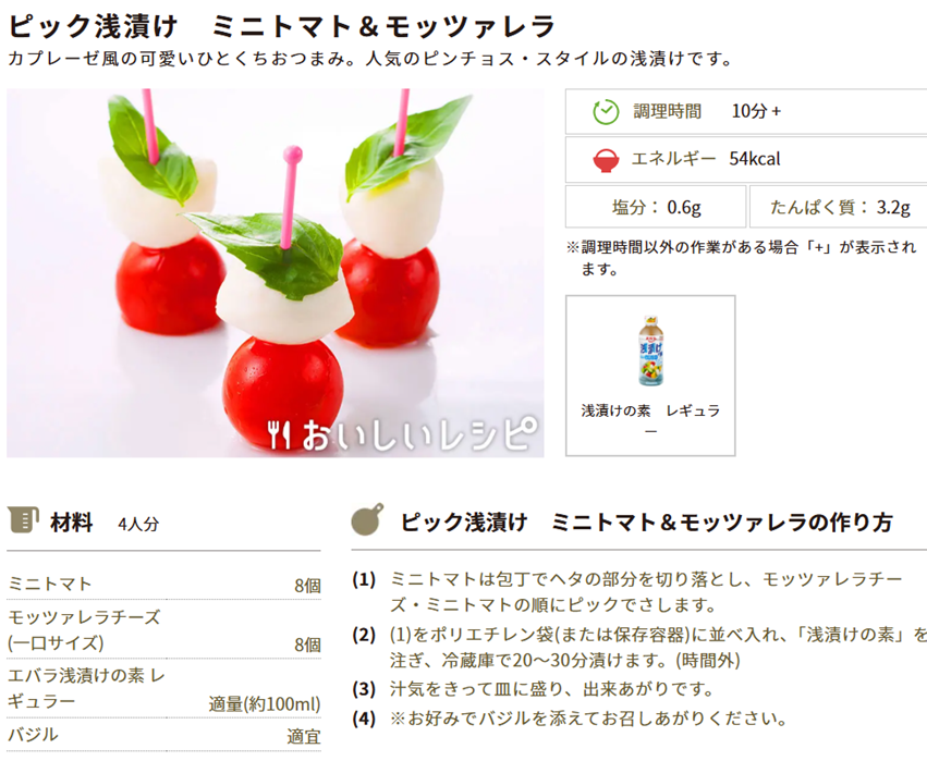 今週のおすすめレシピ①ピック浅漬け ミニトマト&モッツァレラ