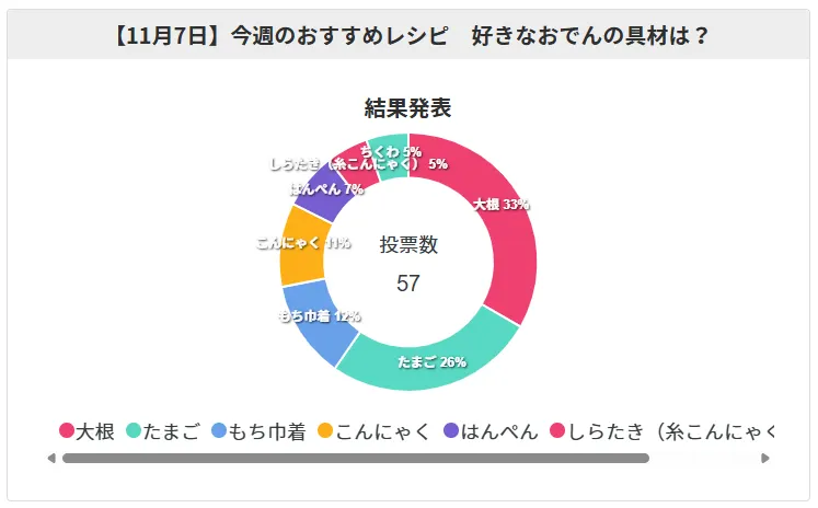 今週のおすすめレシピをお届けする前に、先週の好きなおでん具材の投票結果です🍢