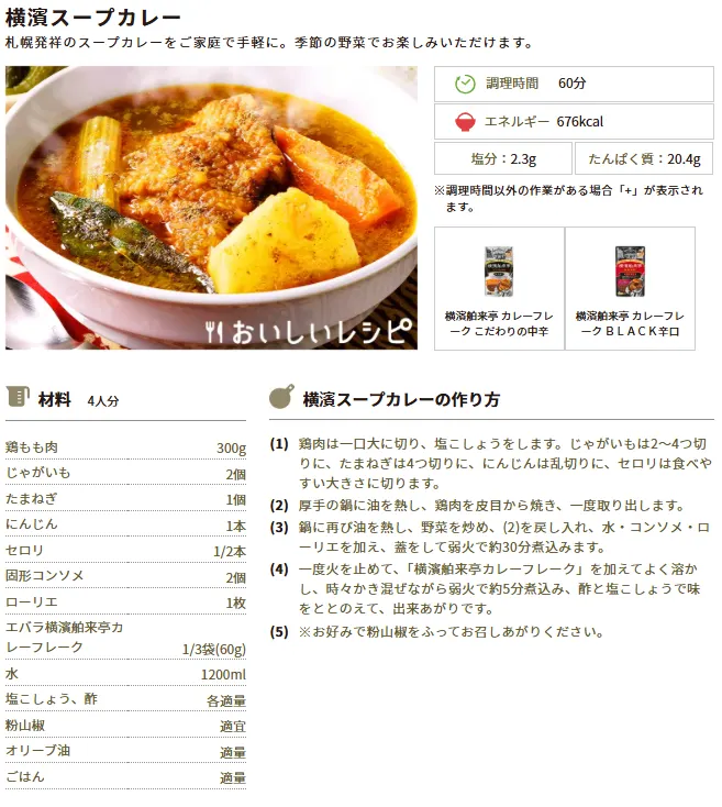 こちらのレシピは「横濱舶来亭 カレーフレーク こだわりの中辛」「横濱舶来亭 カレーフレーク BLACK辛口」を使っています!