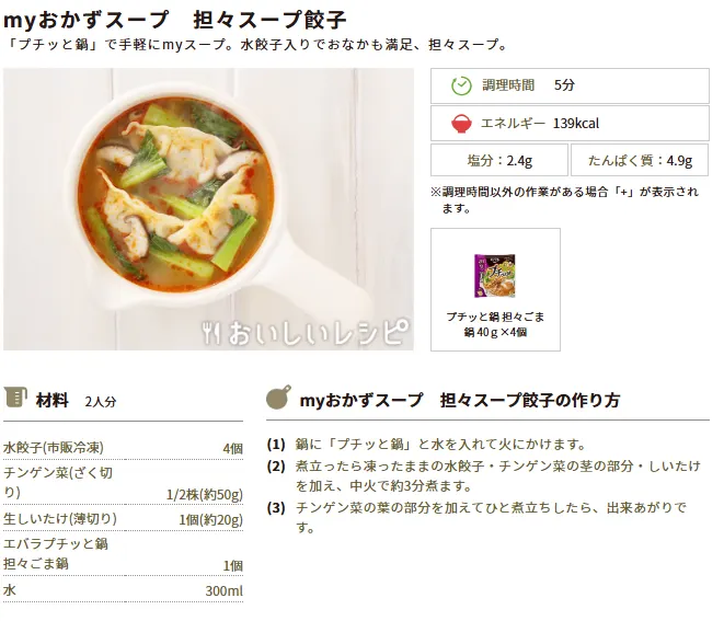 今週のおすすめレシピ④:myおかずスープ 担々スープ餃子