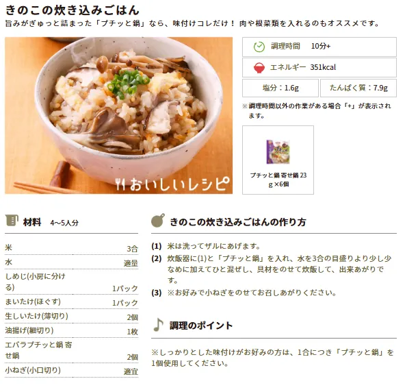しっかりとした味付けがお好みの方は、1合につき「プチッと鍋」を1個使用してください🍲