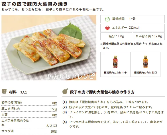 今週のおすすめレシピ②餃子の皮で豚肉大葉包み焼き