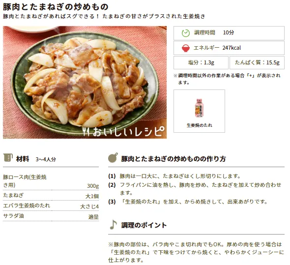 一口大に切った豚肉とたまねぎを炒めて「生姜焼のたれ」で味付けするだけ!