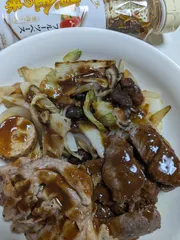 おうち焼肉 塩こしょうにんにくで味付けした野菜炒めと肉におろしのたれ、黄金の味、ごまだれをかけるのです!味が混ざり合ったところも美味しいです😋細切れ肉を使うのがポイントです ※かける前の写真しか撮ってなかった
