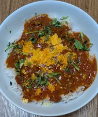 黄金コク旨ボロネーゼ丼 にんにく、たまねぎ、挽肉を炒め黄金の味とトマトを加え、とろみがつくまで炒め煮。