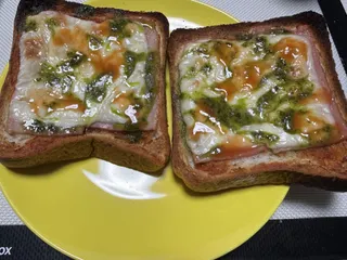 遅く起きた朝にもすぐにできます カリカリに焼いたチーズトースト。タコミートソースを塗ってから焼けば、とってもおいしくできますよ╭( ・ㅂ・)و ̑̑ グッ !"