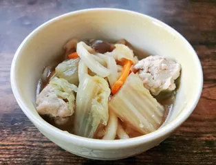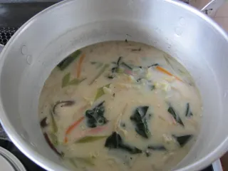 和風だしのシチュー 日々の膳で野菜たっぷりの汁ものを…とだしパックを破って一袋、シチュールウひとかけ、牛乳。スープとシチューの間の感じです。だしのきいてるしっかりした味でおいしい😊