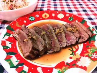 ザクだれ牛のたたき 胡椒とハーブをもみこんで焼いたお肉にザクだれとめんつゆ・酒等をさっと煮たたれをかけて出来上がり♪