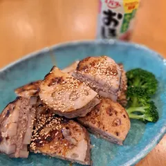 おろしのたれでつくね 鶏のつくねを作って、おろしのたれ オニオン&ビネガーで味付け。おろしのたれ オニオン&ビネガーは鶏肉との相性がすごくいいと思います