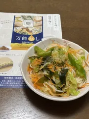 そうめんサラダ にんじんとわかめと万願寺唐辛子とキャベツでそうめんサラダつくりました。にんじんは生のままですが、わかめと万願寺唐辛子とキャベツは切ってレンジで火を通しました。味付けには、万能だしの粉末と醤油を少し加えて作りました。全然調味料を入れていないのに、うまみがすごく出てておいしかったです。
