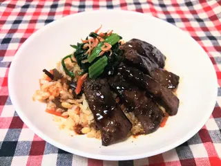 焼き肉ビビンバ ビビンバの素と焼肉のたれを使って作りました♪ビビンバの素に入っているコチュジャンがいいアクセントになって美味しく出来たと思います😊焼肉のたれはちょっと煮詰めて濃厚にして絡めました👍