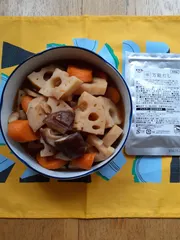 日々の膳で煮物 旬のレンコン、人参、生椎茸を醤油は最小限で、砂糖、酒、味醂も隠し味ていどでサッと炊きました。薄味ですがダシがよく効き、昨日万博に弁当のおかずとして持参し、美味しかったです。