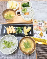 『日々の善 素材だしで朝ごはん』 朝ごはん。しらすが手に入ったので朝ごはんに しらす丼。 夫は生卵派なのですが私はだし巻き卵で。 素材だしでお出汁を取ってお味噌汁とだし巻き卵に。 あご出汁が効いていて美味しかったです。