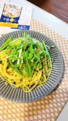 だしパックパスタ 日々の膳でパスタ作りました!フライパンにオイルと日々の膳のパックを破いたもの、水菜、茹でたパスタ、茹で汁で乳化させたら醤油で味を調えて完成。