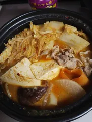 担々ごま鍋 担々ごま鍋の素を使って鍋にしました昼食に昨日作ったさつま芋の炊き込みご飯(残りと一緒にいただきました😊 具材:豚肉、白菜、人参、大根、木綿豆腐、しいたけ、キャベツ、もやし