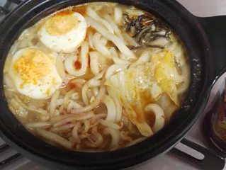 担々ごま うどん お昼に、担々ごま鍋の素を使って鍋焼きうどんを作りました あるもので直ぐに火が通る具材にしました味付けたまご、キャベツ、もやし、黒舞茸